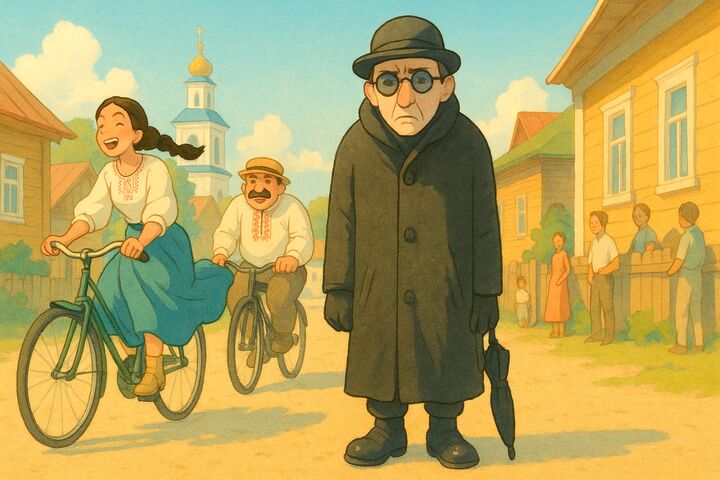 Между тем кто-то нарисовал карикатуры на него и Вареньку, и Беликов переживал такие насмешки очень тяжело. Затем, когда Беликов прогуливался с Буркиным, им навстречу ехал Коваленко с сестрой на велосипедах. Варенька, как обычно, громко смеялась. Этот факт ужасно возмутил Беликова. Он стал рассказывать Буркину, что негоже преподавателю, тем более женщине, ездить на велосипеде.