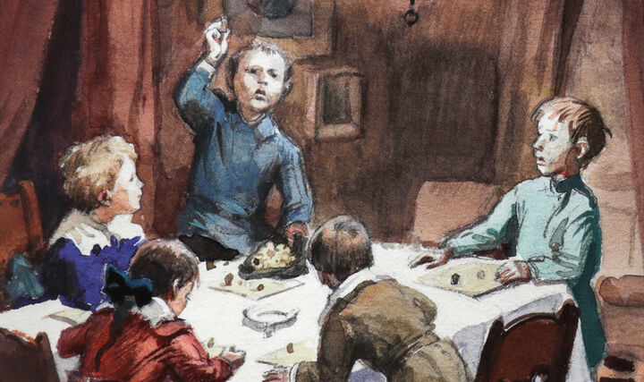 В столовой остались только дети. Давно пришло время ложиться спать, но они хотели узнать подробности о крестинах и дожидались взрослых, играя в лото на деньги. Ставка в игре — копейка, а тех, кто пытался смошенничать, выгоняли вон. Цифры в карточках закрывали стёклышками. Играли с азартом.