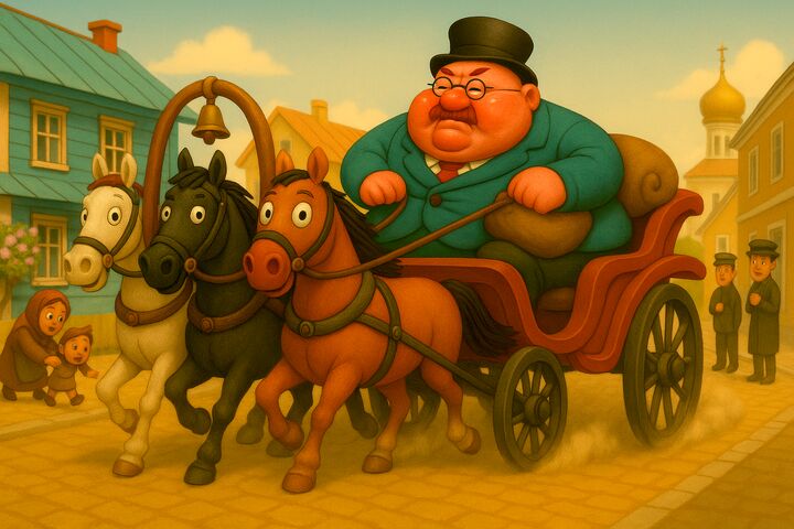 Когда он, пухлый, красный, едет на тройке с бубенчиками… то картина бывает внушительная, и кажется, что едет не человек, а языческий бог.