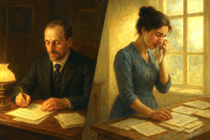 Снизу доносились рыдания жены. Уставший Павел Андреевич чувствовал, что поступает гадко, и решил уехать на следующий день. Он собрал бумаги и пошёл к жене, чтобы вернуть их.