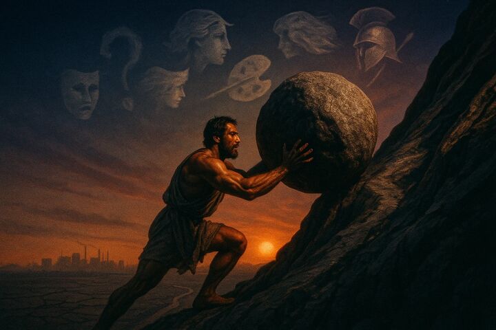 Сизиф учит высшей верности, которая отвергает богов и двигает камни… Одной борьбы за вершину достаточно, чтобы заполнить сердце человека. Сизифа следует представлять себе счастливым.
