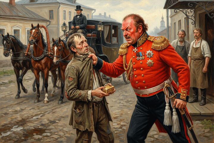 Ругаясь, Платов схватил Левшу за шиворот и кинул его в готовую к отъезду коляску, намереваясь доставить мастера к императору.