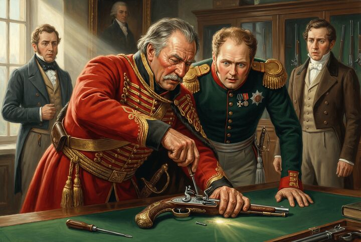 Англичане заметили разногласия между императором и казаком, решили воспользоваться этим и продемонстрировали ружьё собственного изготовления и пистолю неизвестного происхождения, сделанную неким неподражаемым мастером.