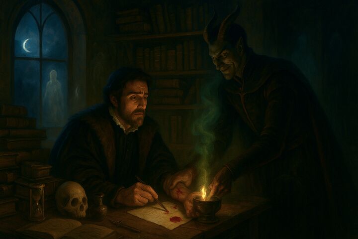 Фауст колеблется. Добрый ангел уговаривает его бросить занятия магией, раскаяться и возвратиться к Богу. Злой ангел внушает ему мысли о богатстве и славе. Возвращается Мефистофель и говорит, что Люцифер приказал ему служить Фаусту до гроба, если Фауст кровью напишет завещание и дарственную на свою душу и тело. Фауст согласен, он вонзает нож себе в руку, но кровь стынет у него в жилах, и он не может писать. Мефистофель приносит жаровню, кровь Фауста согревается, и он пишет завещание, но тут на руке его появляется надпись «Homo, fuge» («Человек, спасайся»); Фауст не обращает на неё внимания. Чтобы развлечь Фауста, Мефистофель приводит дьяволов, которые дают Фаусту короны, богатые одежды и танцуют перед ним, затем удаляются. Фауст расспрашивает Мефистофеля про ад. Мефистофель объясняет: «Единым местом ад не ограничен, / Пределов нет ему; где мы, там ад; / И там, где ад, должны мы вечно быть». Фаусту не верится: Мефистофель разговаривает с ним, ходит по земле — и все это ад? Такой ад Фаусту не страшен. Он просит Мефистофеля дать ему в жены самую прекрасную девушку Германии. Мефистофель приводит к нему дьявола в женском обличье. Брак — это не для Фауста, Мефистофель предлагает каждое утро приводить к нему самых красивых куртизанок. Он вручает Фаусту книгу, где все написано: и как добывать богатство, и как вызывать духов, в ней описано расположение и движение планет и перечислены все растения и травы.