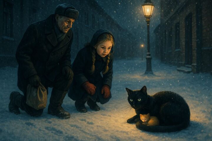 Пришлось рассказчику с дочкой пойти за кошкой. Та обрадовалась и повела их за собой. Прогнав приставшую к ней собаку, кошка выбежала на тротуар, легла и скрутилась калачиком. Подойдя ближе, рассказчик увидел, что кошка пытается согреть маленького, ещё слепого котёнка. Видимо, она привела людей, чтобы те ей помогли.