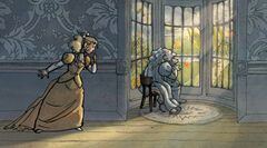 Мощный порыв ветра распахивает тяжёлые, старинные двери в комнату — за ними в окровавленном саване стоит леди Мэдилейн.