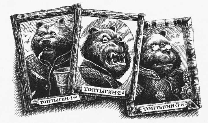 В это же время Лев отправил в соседний лес Топтыгина 2-го. Этот Топтыгин был умнее, он понимал, что от его первого шага зависит многое, и решил совершить крупное злодеяние — уничтожить университет либо типографию. Но оказалось, что типографский станок давно сожгли, студентов академии забрали в солдаты, а профессоров замуровали в дупле, где они и сейчас спят летаргическим сном.