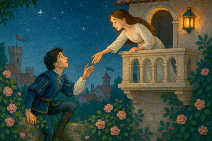 Ночью Ромео взобрался по верёвочной лестнице в спальню Джульетты и пробыл там до зари. Влюблённых разлучила песня жаворонка.
